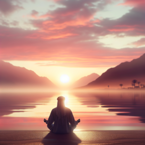 A tranquil sunrise scene with soft hues of orange and pink lighting up a calm lake, where a solitary figure sits in meditation on the shore, embodying the pursuit of inner peace and spiritual purpose.