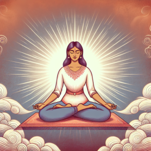 A serene illustration of a person sitting cross-legged on a mat, surrounded by a glowing aura, symbolizing inner peace and mindfulness. The background depicts soft, swirling clouds to represent the calming effect of controlled breathing.