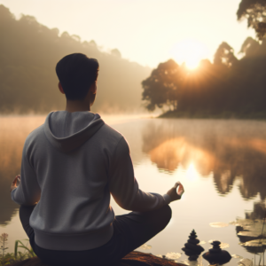A serene scene of a person meditating near a tranquil lakeside during sunrise, with soft hues of morning light reflecting off the water, symbolizing inner peace and self-awareness